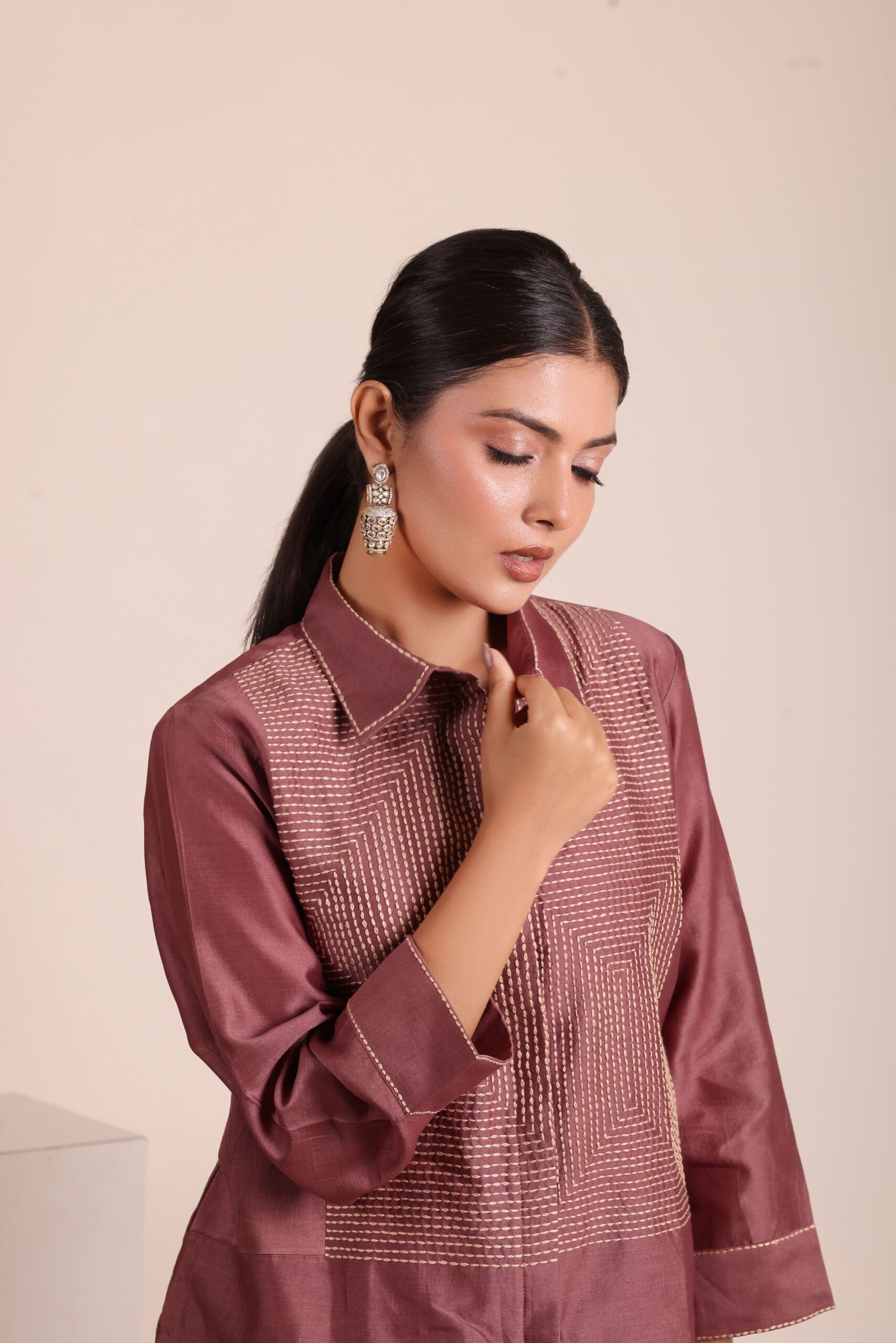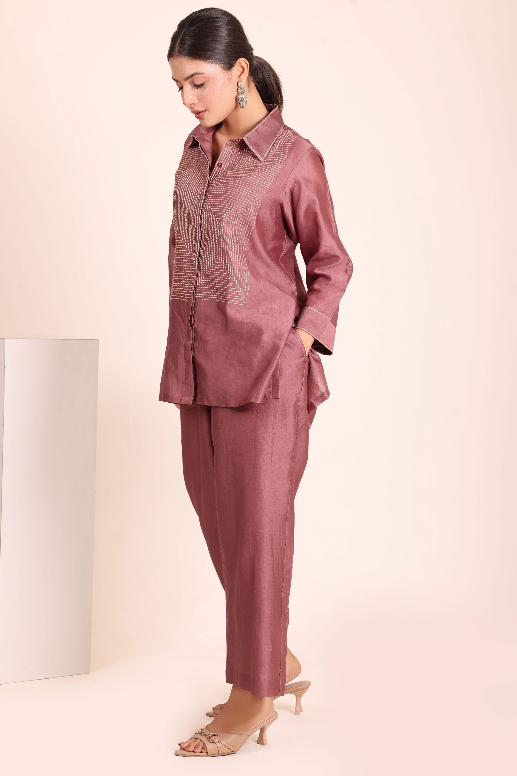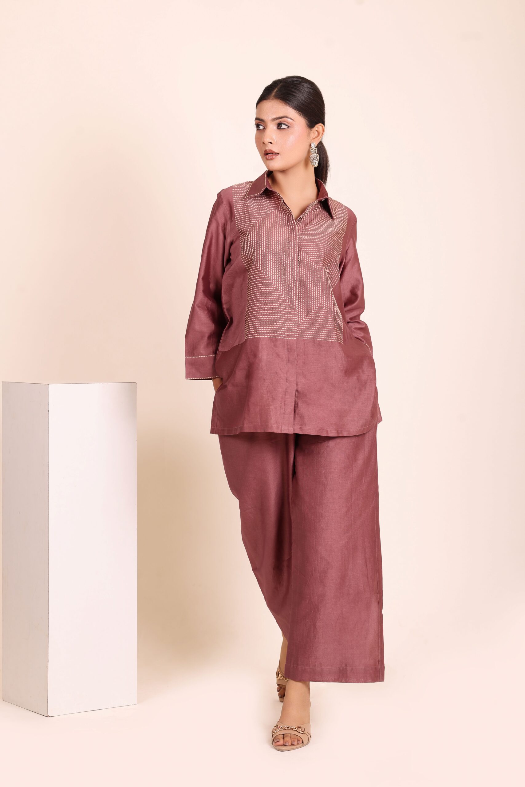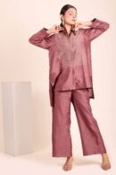 Elevate your style with this chic brown co-ord set. Featuring a collared shirt with intricate embroidery and matching pants. Perfect for a sophisticated look.