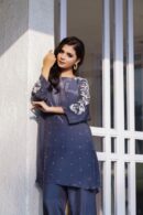 Flirty Sihouette with a splash of elegance the grey set hand embroidery of sellers and completing look with crepe grey pants .