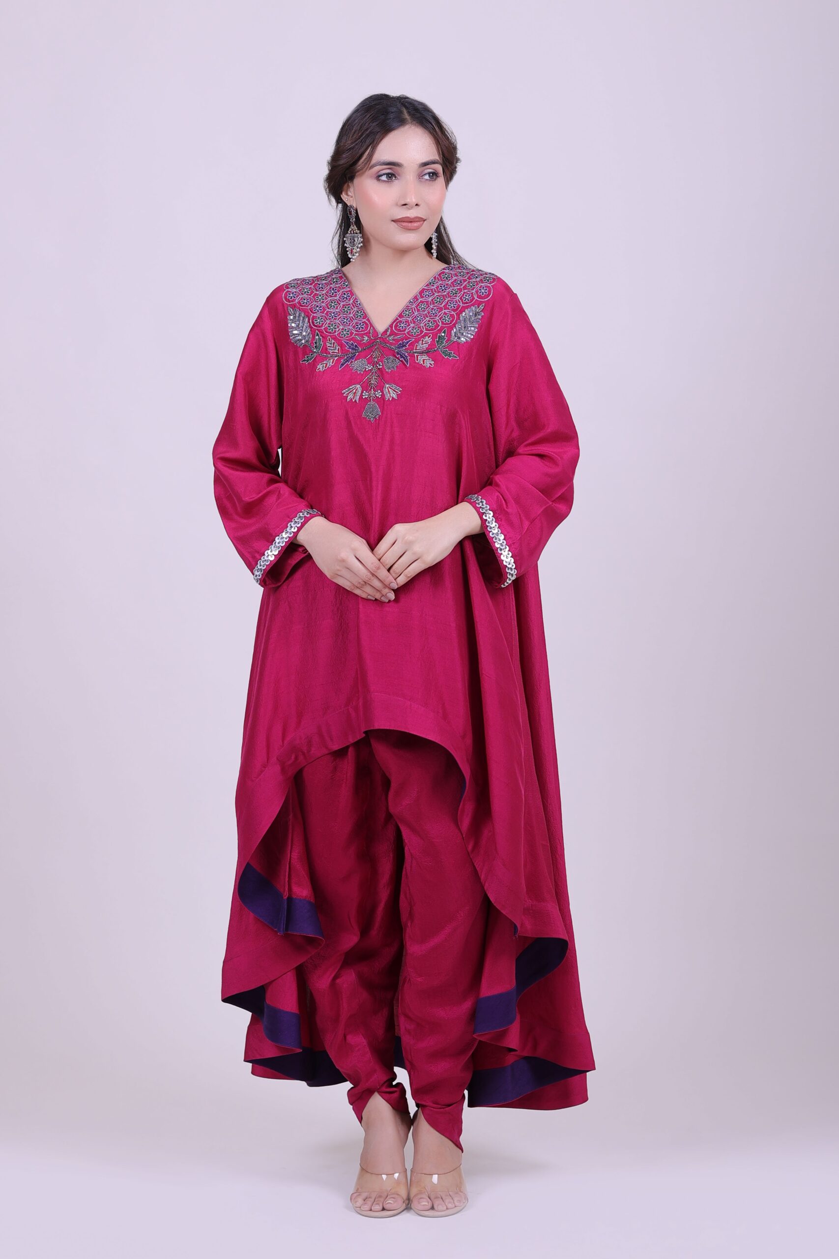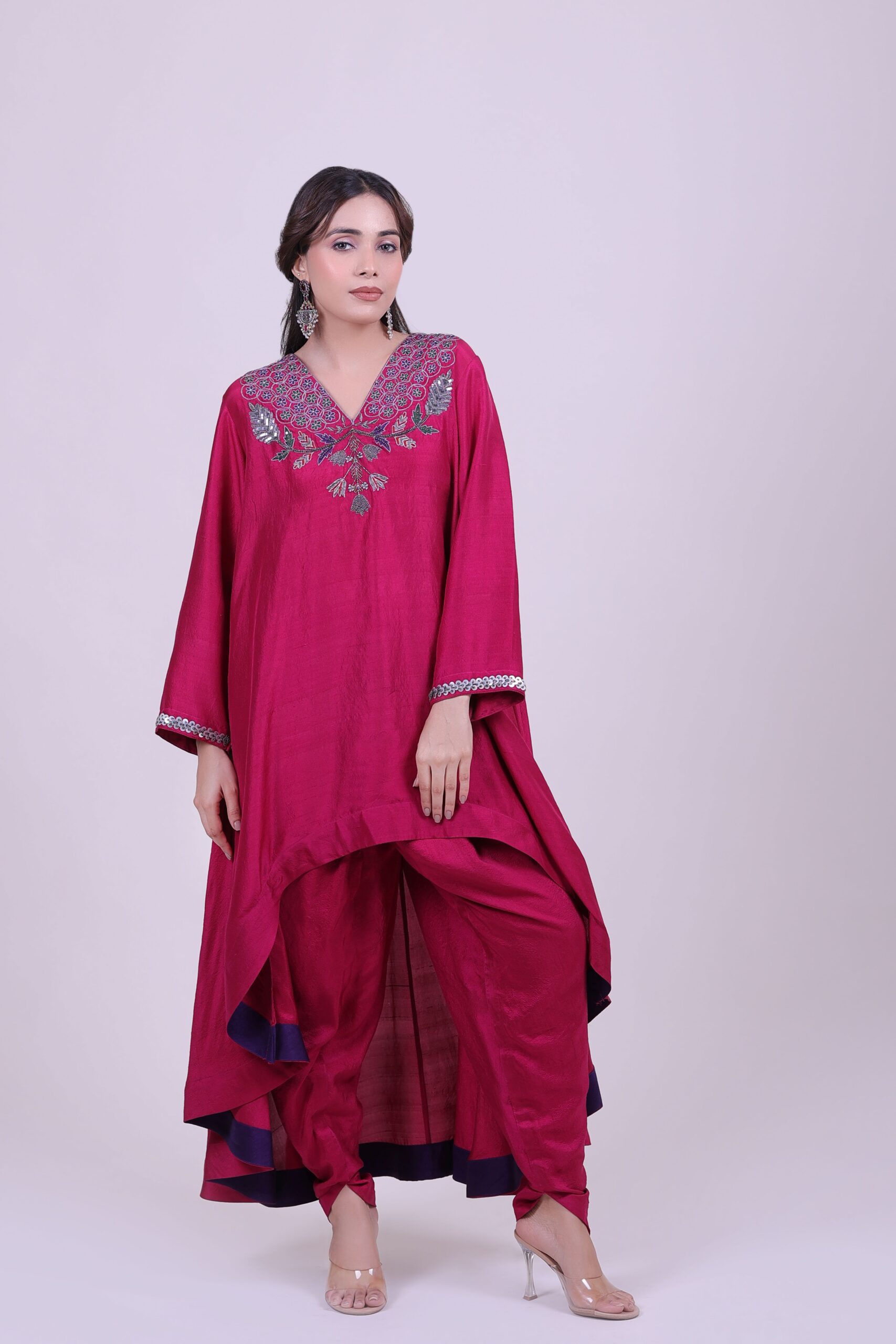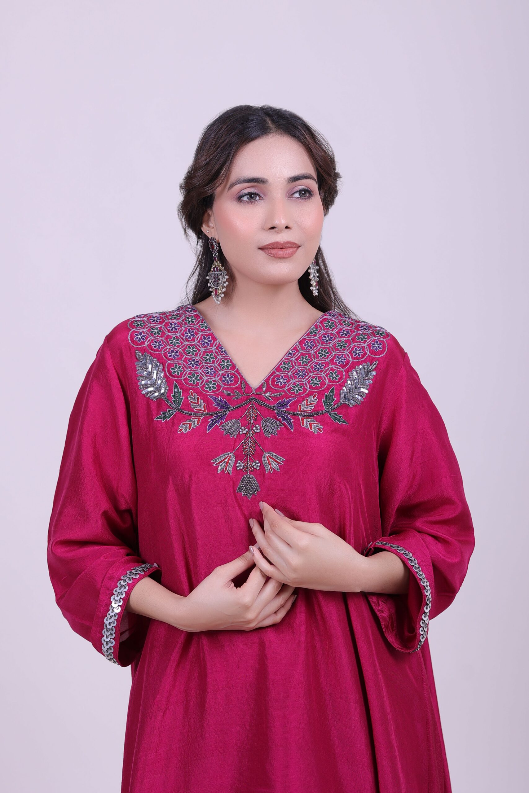 Elegant pink kurti with intricate silver and green embroidery on the neck and sleeves. Perfect for festive occasions or everyday ethnic wear. Stylish and comfortable for women in India.