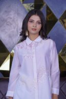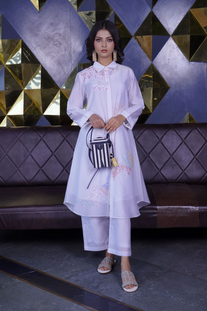 Flirty Sithouettle with a splash of elegance this chanderi set is inspired by Moti Embroidery .