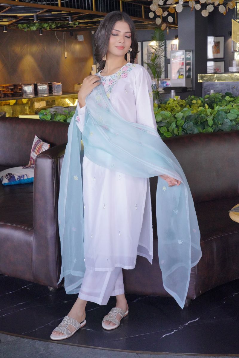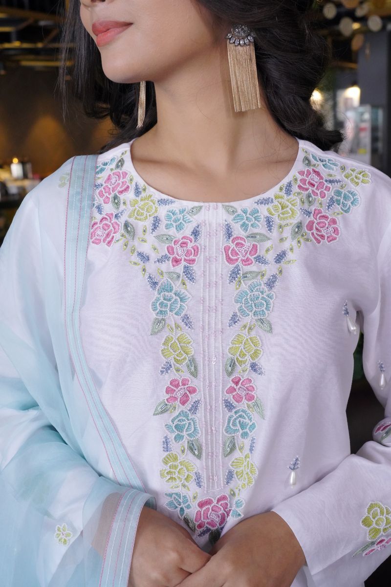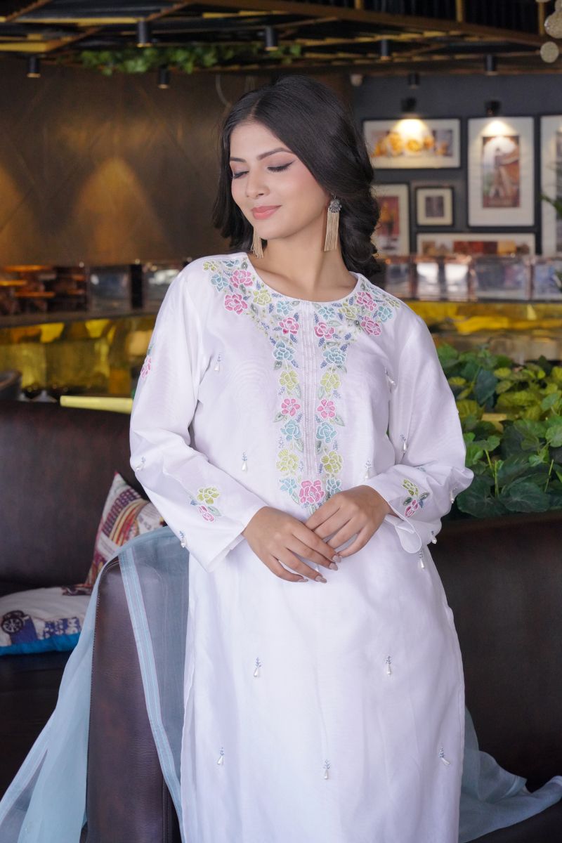 White Kurta chadneri set with embroidered details. Colour full Resham hand work with chanderi pant & embroidered orgenza dupatta .